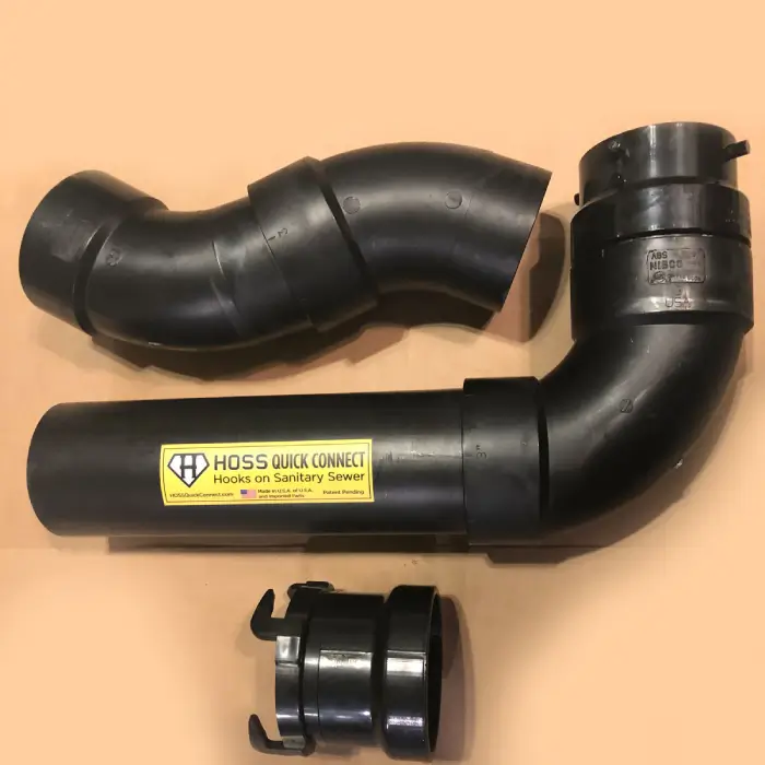 The Motor Home Adapter Kit allows owners of Motor Homes to connect to the Hoss Quick Connect for a Quick Setup, Quick Drain and Quick Flush. This Kit comes with a Bayonet Flange glued to a 90-degree elbow. The elbow has a length of 3” pipe glued to it that can be cut to length for each individual Motor Home. I also include two streel ells for owners to adjust the kit to fit their individual RV. And lastly, there is a 360-degree hose adapter flange that is glued to the upper end and connects to your bayonet flange on your RV. This is an Easy way for Motor Home owners to connect to the Hoss Quick Connect.